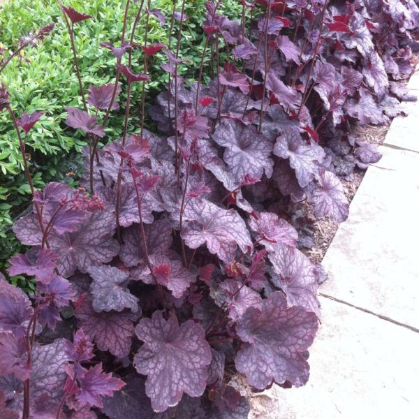 ?Coral Bell Plum Pudding colored foliage has darker purple veins. The leaves have a nice ruffle and pointed tips. Forms a spreading clump and makes an excellent ground cover when planted in a mass.? Creamy white flowers appear in early summer.?Easy to grow with little maintenance and is virtually pest and disease free. Grows best in part shade, in rich, medium and well drained soil. It attracts to butterflies and often are ignored by deer.