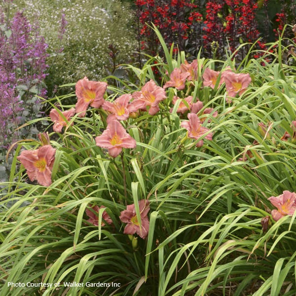 Rosey Returns is a dwarf everblooming Daylily. Fragrant rosy, pink flowers appear in clusters that rise right above the foliage. Flowers bloom from May to September. Hence its name flowers only last one day. Plants should be deadheaded for cosmetic purposes. Pollinator attractor. Plant with other daylilies like Stella De Oro, Purple De Oro for a bright stunning display.