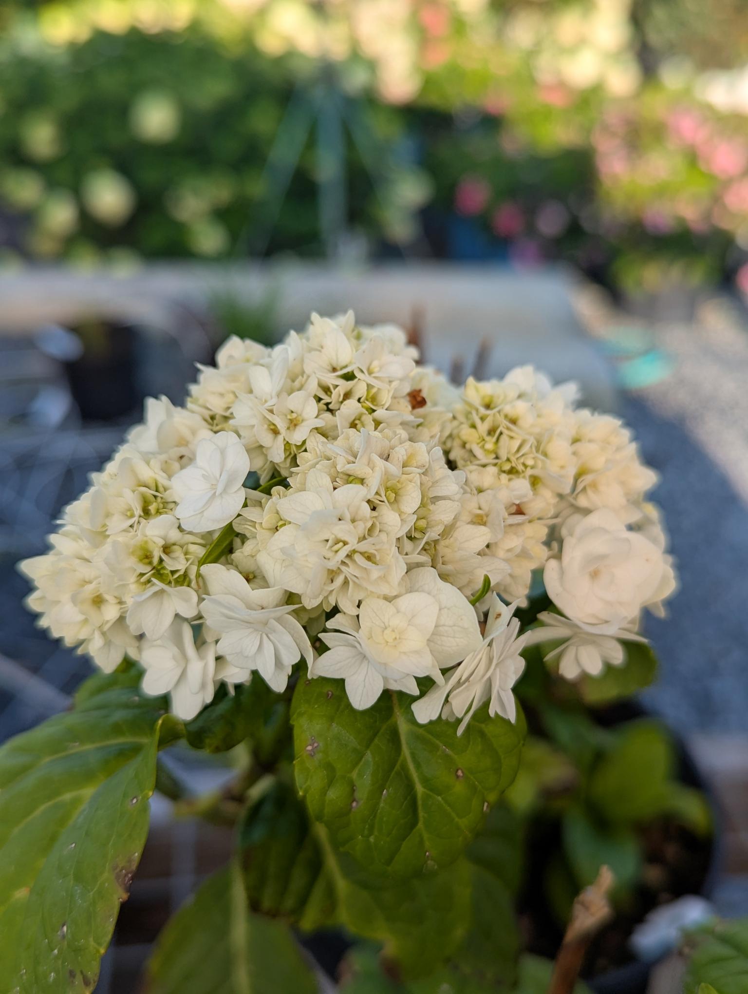 Big Leaf Wedding Gown Hydrangea is like a mini wedding bouquet with double flowers surrounding the center with smaller ones. This hydrangea is hardy and stays compact with strong stems. Cover with mulch for winter protection. With its smaller stature plant as a border or in a container on a patio. Like other Macrophyllas Hydrangea the PH does not determine the color. Prefers light shade. Goes well with Astilbe and Hosta’s.