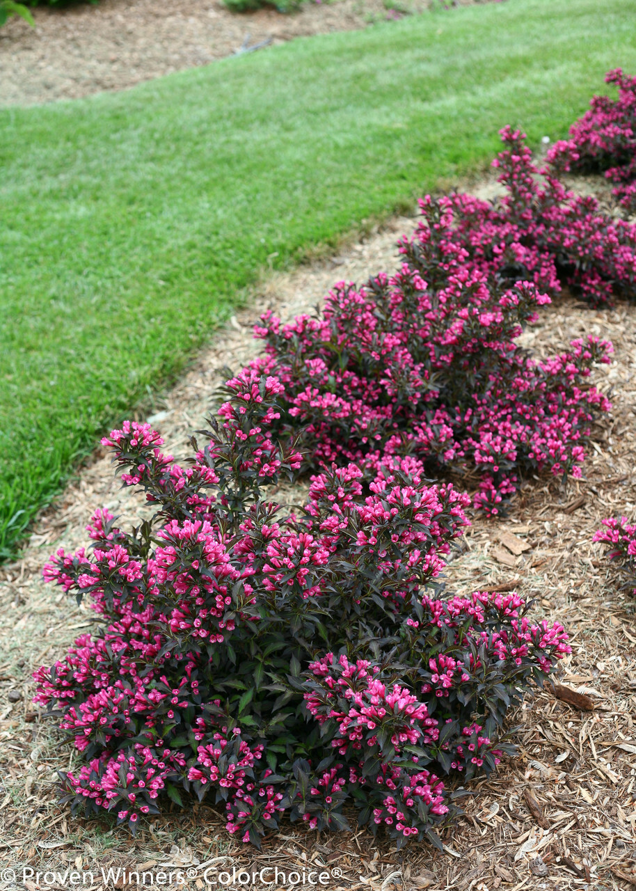 Proven Winners Spilled Wine Weigela has dark red, wavy leaves and a spreading habit. Its hot pink-magenta flowers are similar to those of Wine & Roses, but this is a smaller plant that is wider than it is tall. Its foliage, a dark black-purple with an attractive wavy margin, will not fade to green like some older selections. The tubular flowers are adored by Hummingbirds!