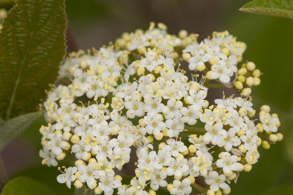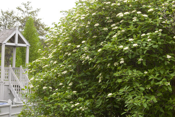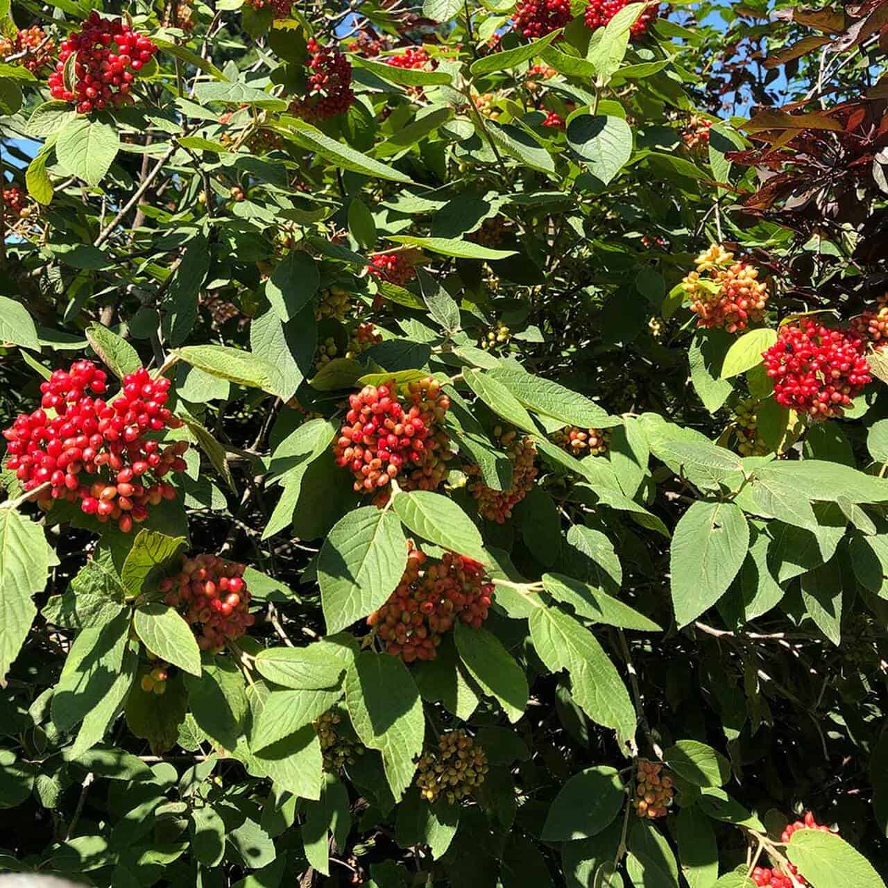 Mohican Viburnum is selected for its compact growth. Creamy white, flat-topped flowers cover the plant in late April or early May, followed by orange-red fruit in early July lasting a month before turning black in fall. Foliage turns a purple bronze in autumn. Makes a nice hedge. Resistant to bacterial leaf spot.