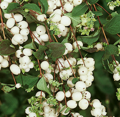 White Snowberry has tiny pink flowers in summer. This shrub has conspicuous large, white berries in autumn that linger on the stem all winter long. Does well in full sun and half shade. Does better in moist locations.? This is a excellent shrub for erosion control on steep banks.?