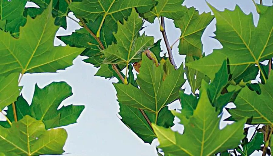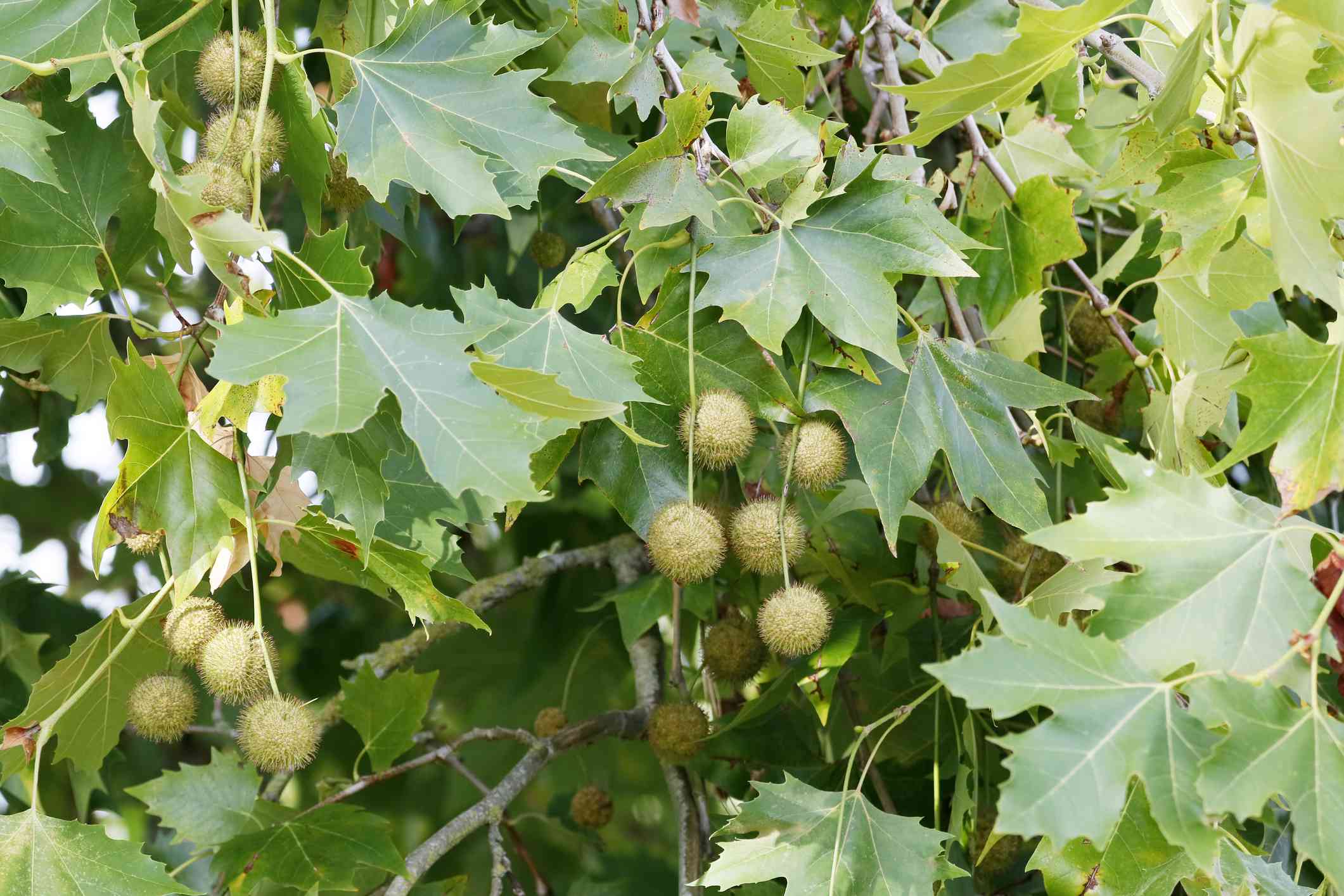Columbia London Planetree is a deciduous tree with a pyramidal form. Its coarse texture stands out from other landscape plants. Large five-lobed, dark green leaves contrast well against its peeling bark. The bark is gray-yellow to gray-orange when new and gray-green with mature age. Come fall, the leaves turn yellow and drops, showcasing its fascinate bark patterns. Its fruit balls are spiky spheres, which are unique on there own. (*Caliper is Width of Tree Trunk)
