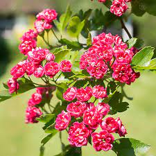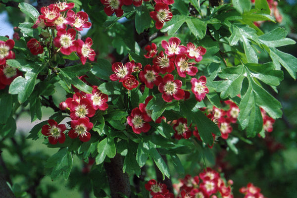 Crimson Cloud Hawthorn bears exceptionally large, single bright red flowers with a star-shaped white area in the center of each bloom. Although the flowers might be small, they are plentiful and spectacular in color, detail, and fragrance.??Oh, the fragrance! This tree is perfect for a small up-close garden specimen, or tough enough to be a long-lived street tree. Resistant to leaf spot diseases, it provides a second colorful display in fall when covered with glossy red fruit which persists into winter.