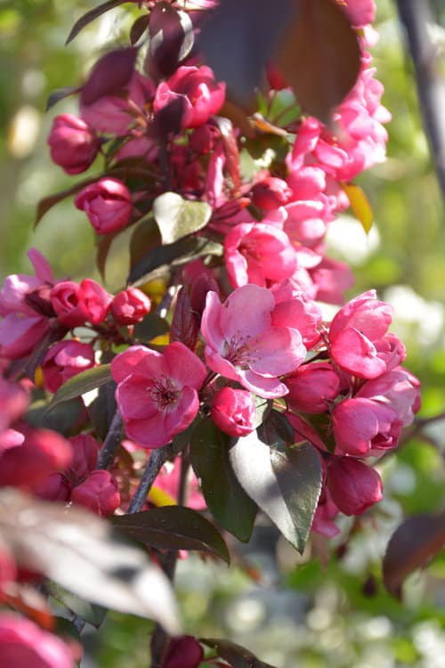 First Editions? Gladiator Crabapple is an excellent ornamental tree with a profusion of bright pink flowers followed by small reddish-purple fruit on a stately, upright crown. Glossy bronze-purple leaves are darker and glossier than Purple Prince, remain lush all season long and are highly disease resistant. Gladiator is an ideal ornamental tree for space-challenged sites including under power lines, as a small boulevard tree or planted in a row for a screen. This is an open pollinated selection of ‘Royalty’. The burgundy tinted foliage add contrast and color all season long. (*Caliper is width of tree trunk).