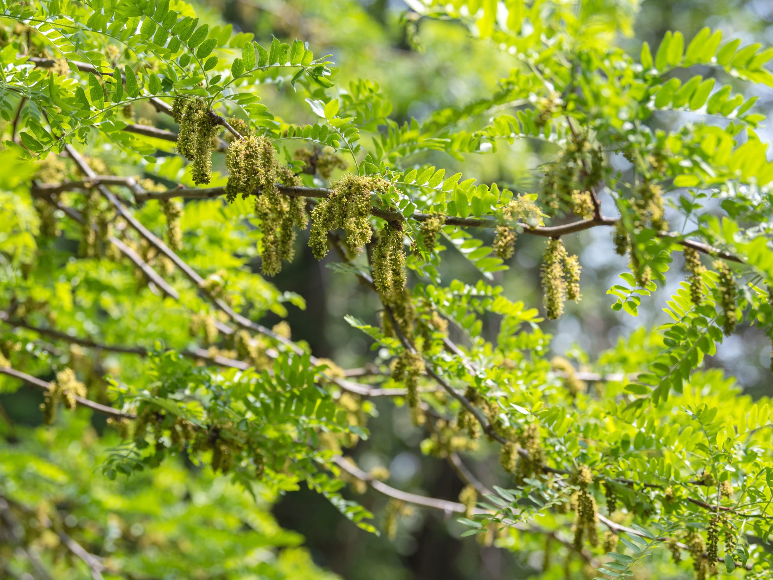 Sunburst Honeylocust cultivar is noted for foliage that emerges bright golden-bronze, fades to green as it matures, then colors golden-yellow again in fall. Thornless and seedless, it is great for light, filtered shade. Deer don’t particularly care for this plant.