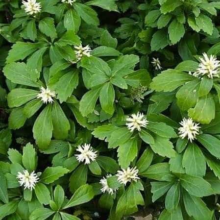 Pachysandra is a evergreen ground cover that has oval leathery greens that will spread in almost any soil. Tiny white flowers bloom in early spring, flowers are not particularly showy, but take a closer look and you will find they are quite attractive. Plant under a tree canopy or use as a lawn substitute. Will handle full shade and full sun and is Deer Resistant.